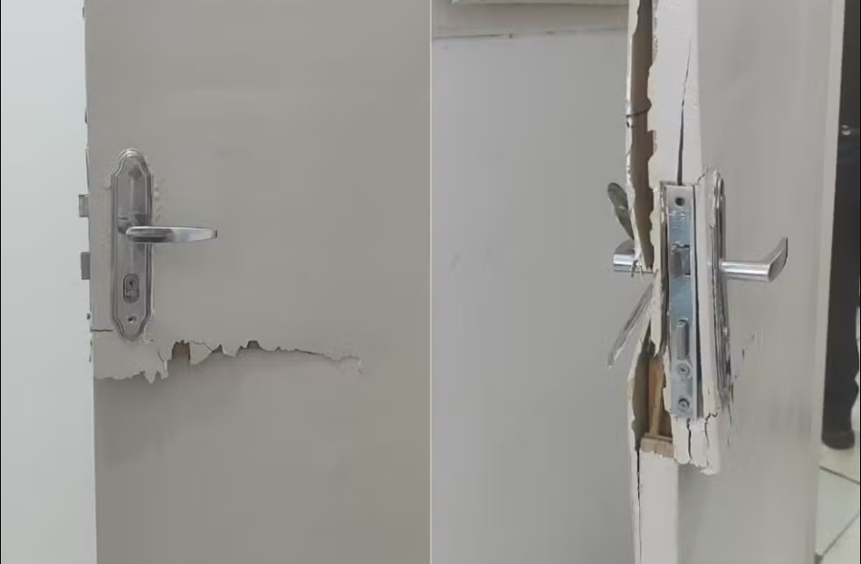 Imagens obtidas pela equipe mostram o estado da porta do consultório após a invasão. A médica solicitou afastamento do serviço após o trauma causado pelo episódio.