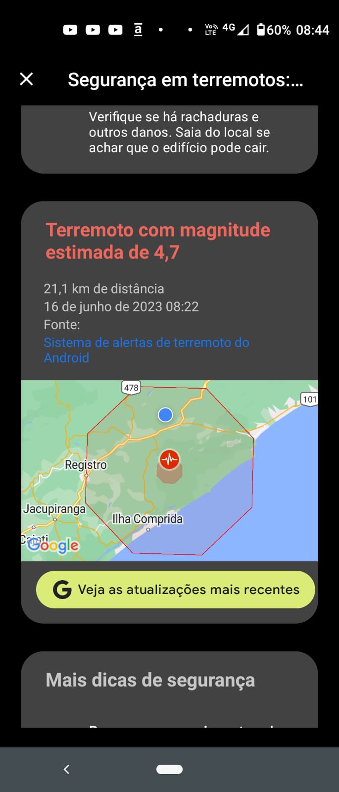 A Defesa Civil do estado confirmou dois abalos sísmicos na região de Miracatu, próxima ao litoral, por volta das 8h22. A intensidade confirmada foi de 4,7 e 4,9 — a maior escala é 9.