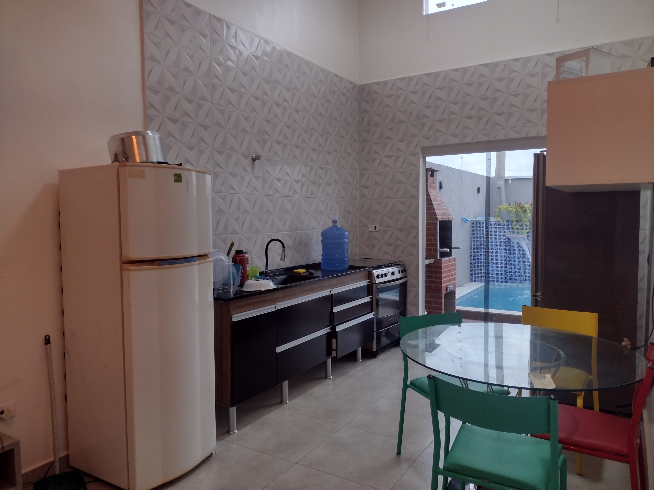 Cozinha com porta de vidro para churrasqueira e piscina;