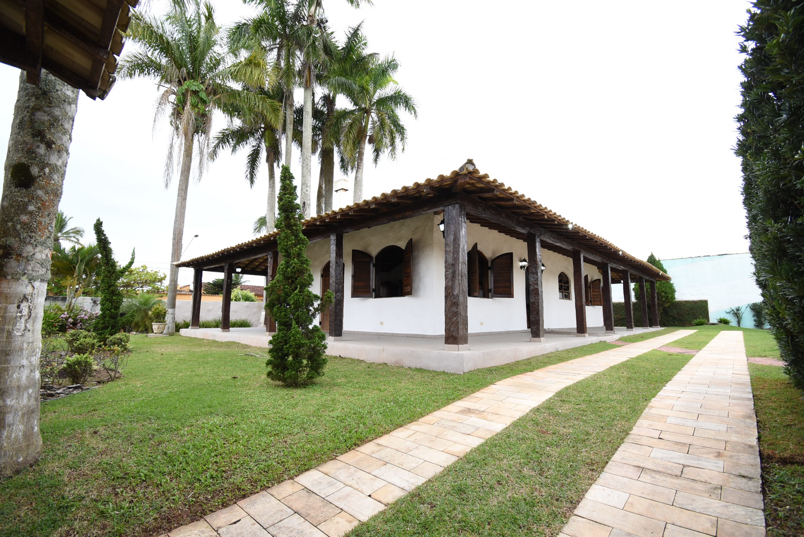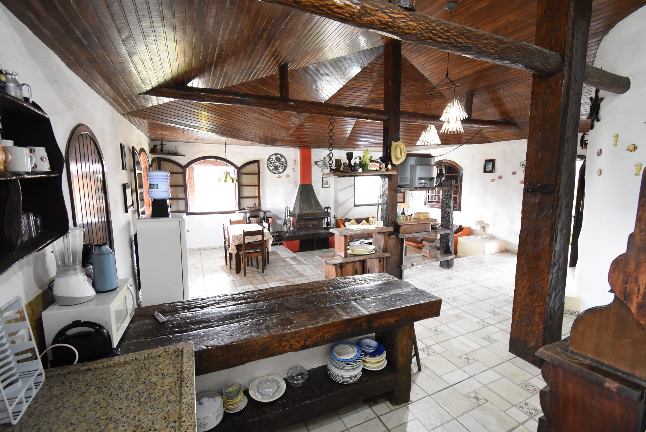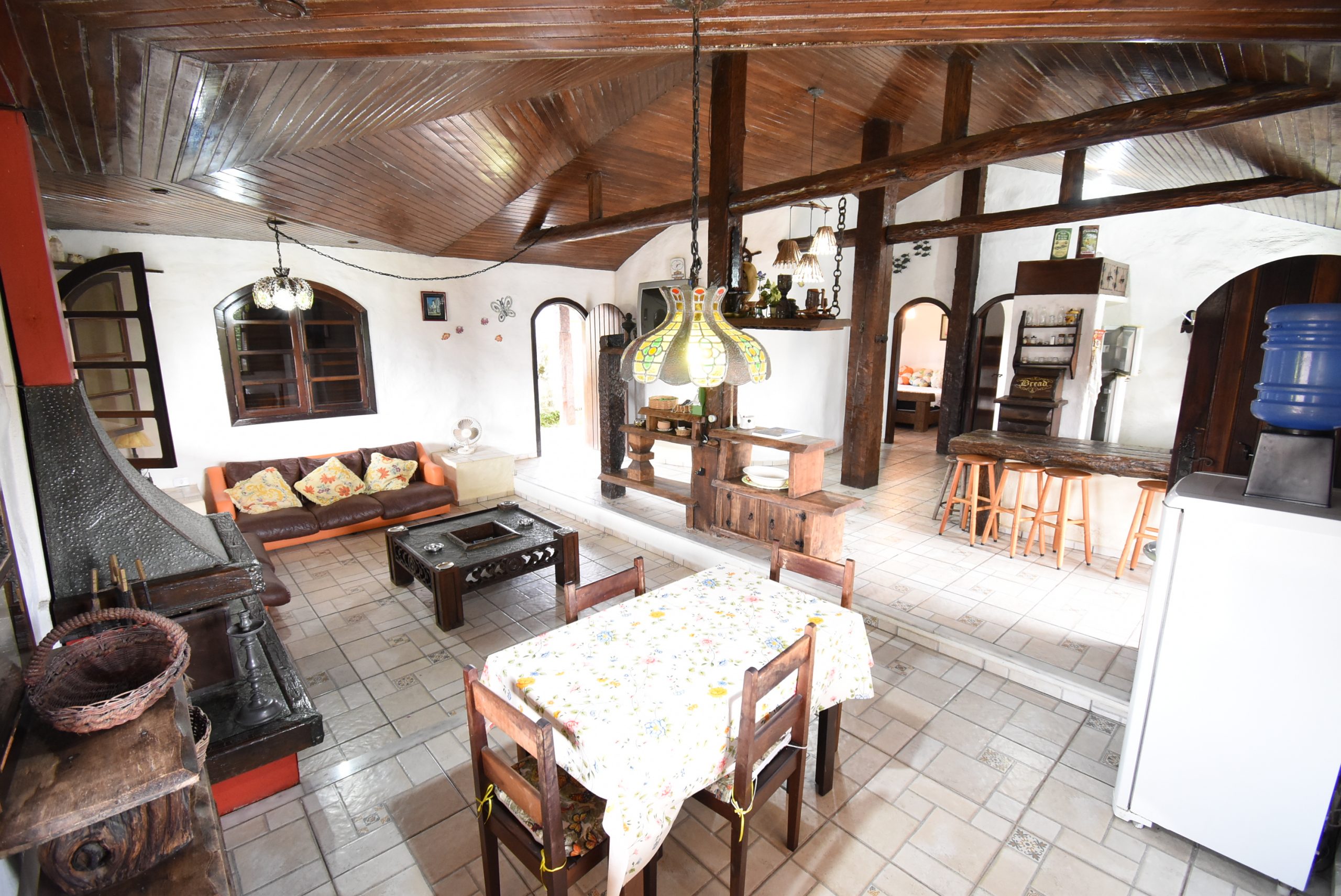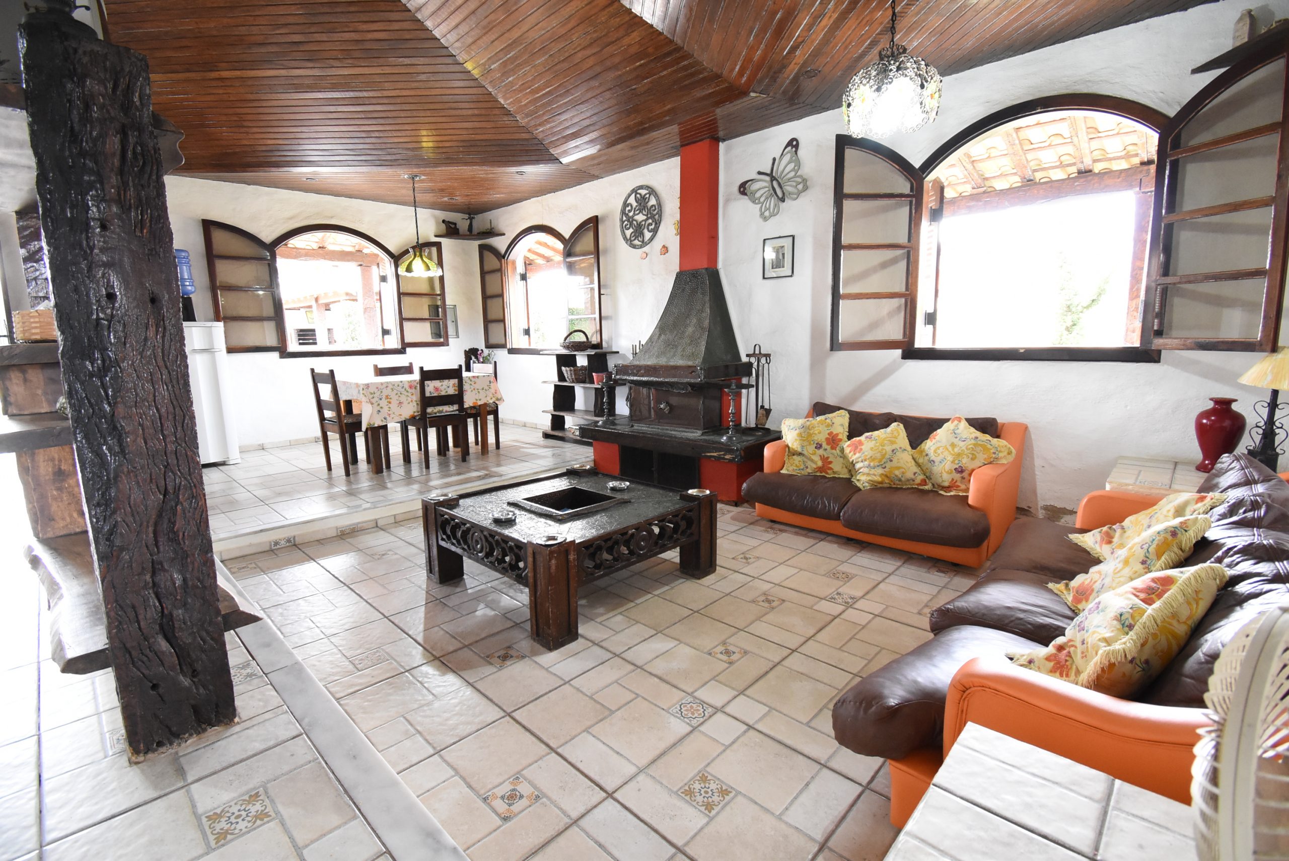 Área interna: sala de jantar, sala de tv com lareira, cozinha integrada, banheiro social, 3 quartos sendo 2 suítes.