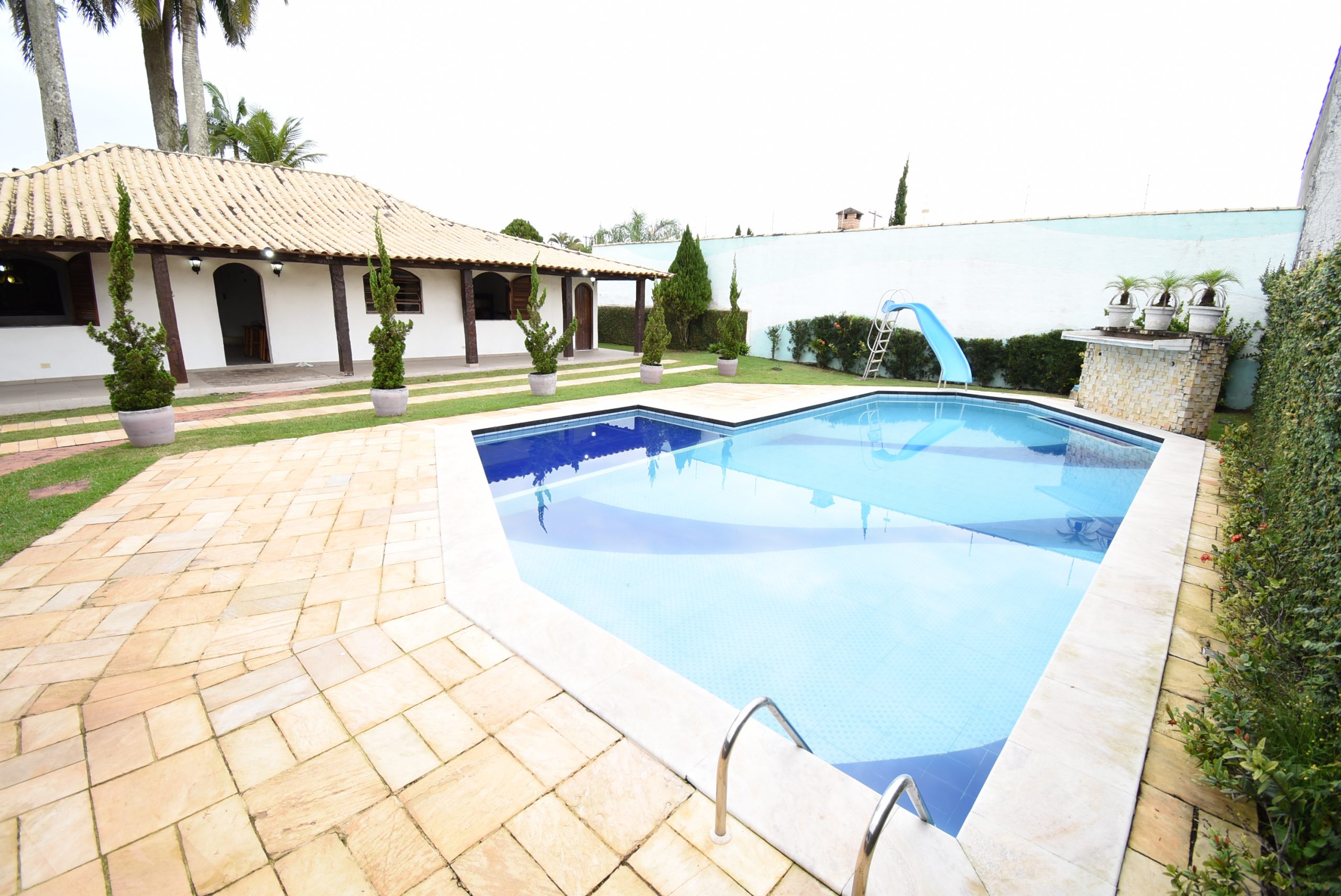 Ampla área de lazer com: jardim, piscina com cascata, área de churrasco completa, lavabo externo e depósito.