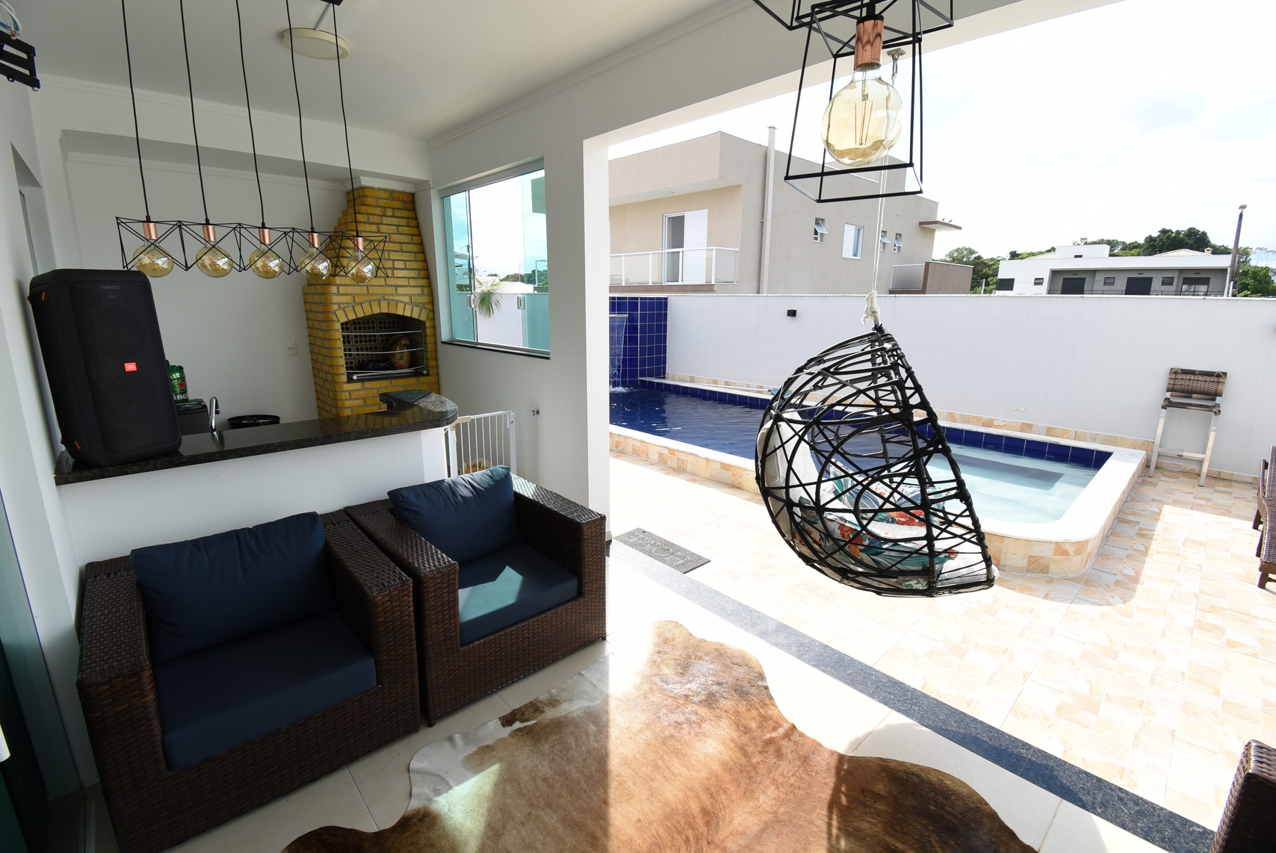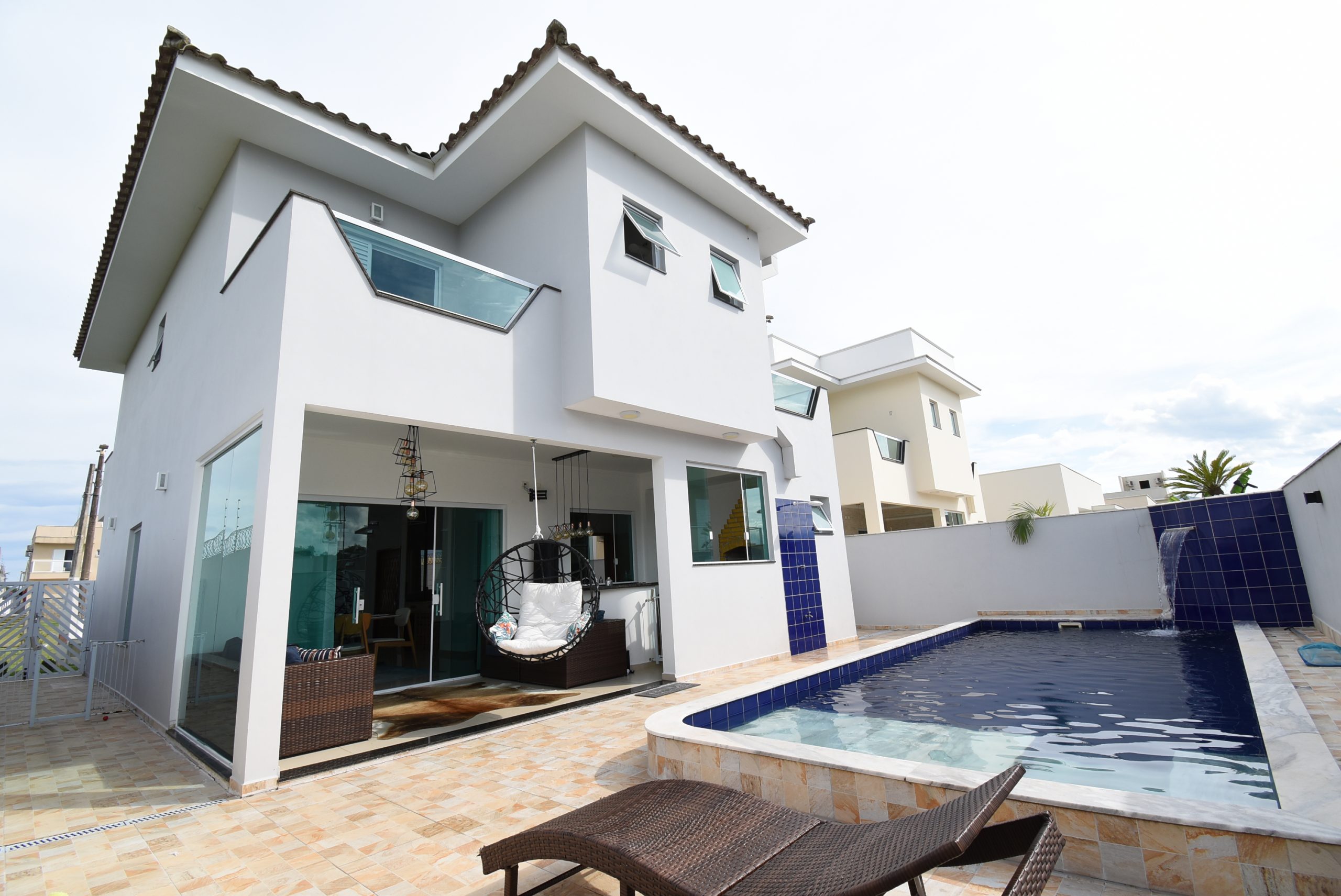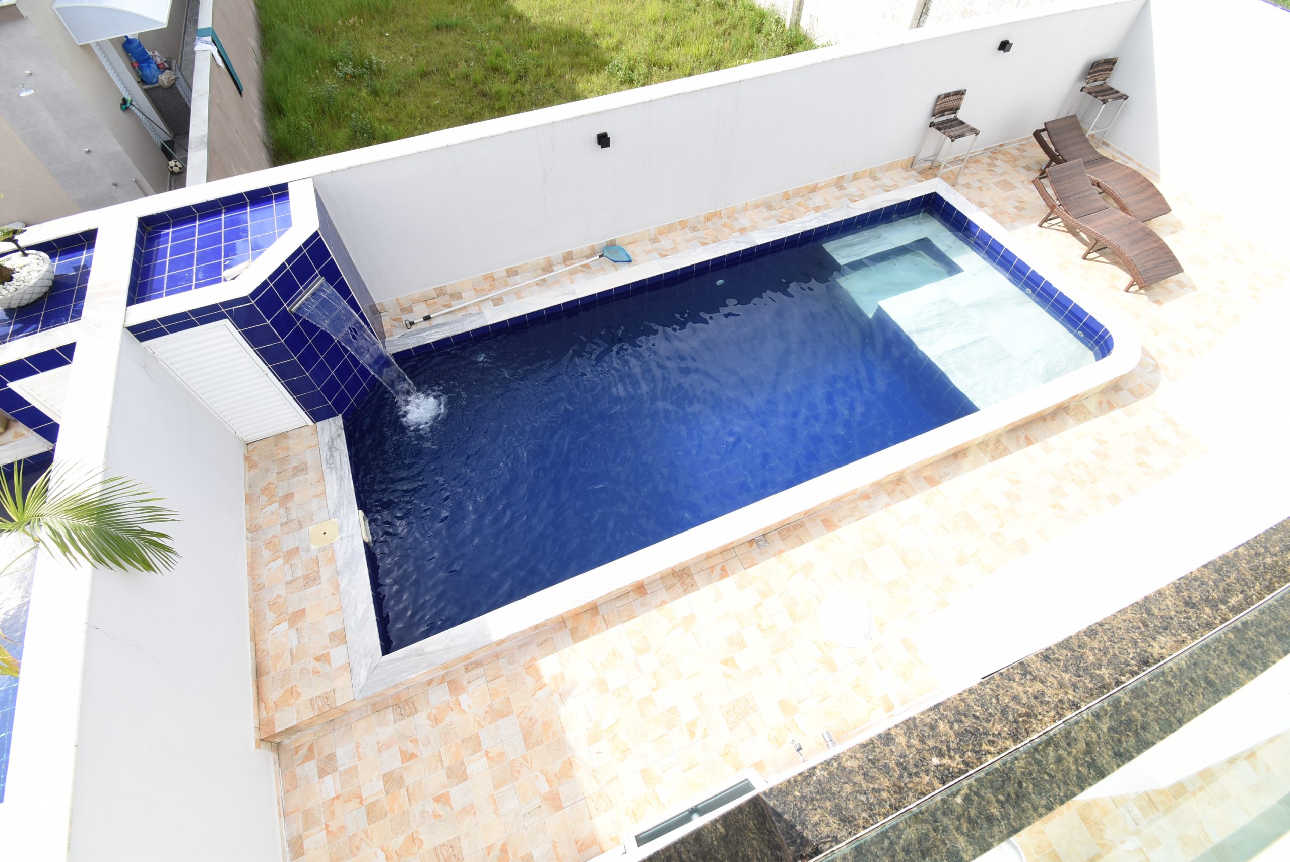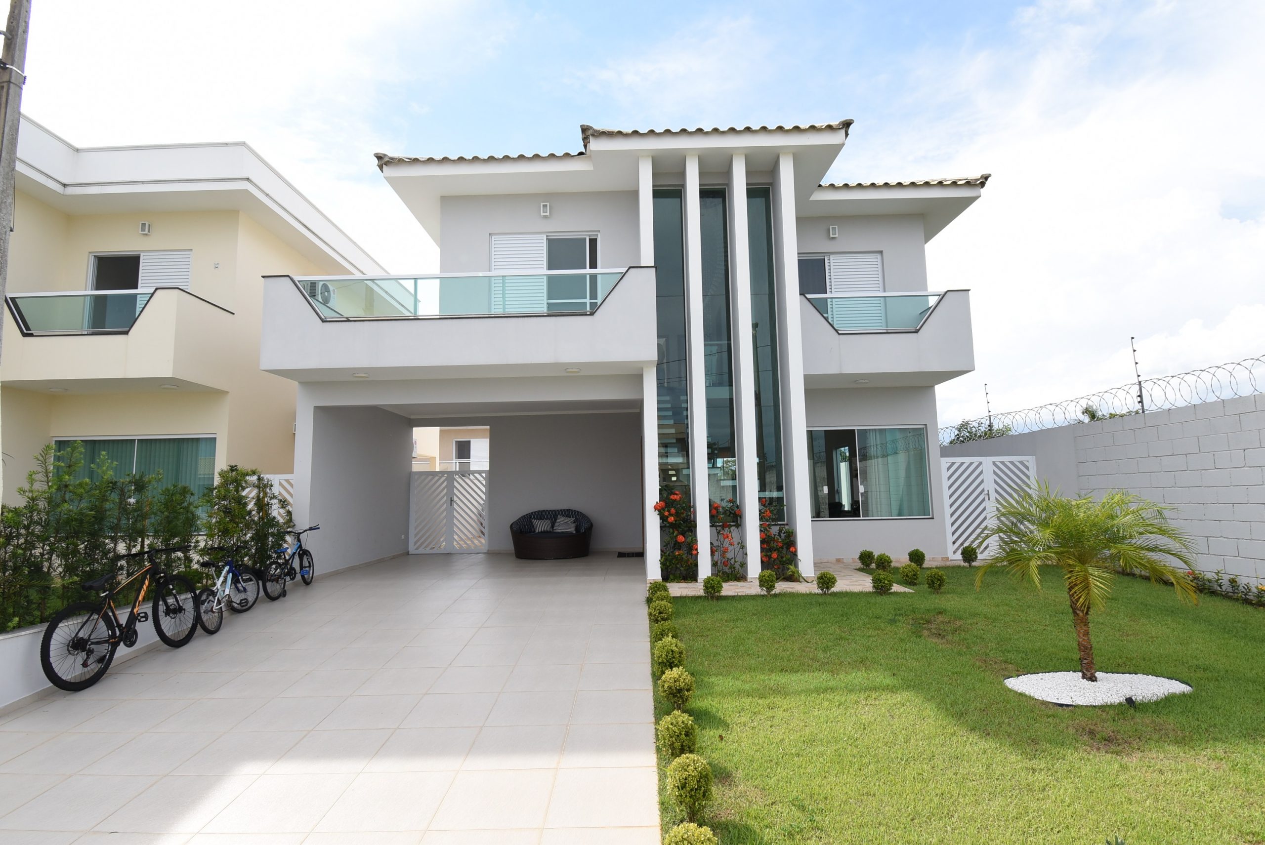 – 4 vagas de garagem, jardim, piscina com cascata, área gourmet, ducha externa e banheiro social externo;