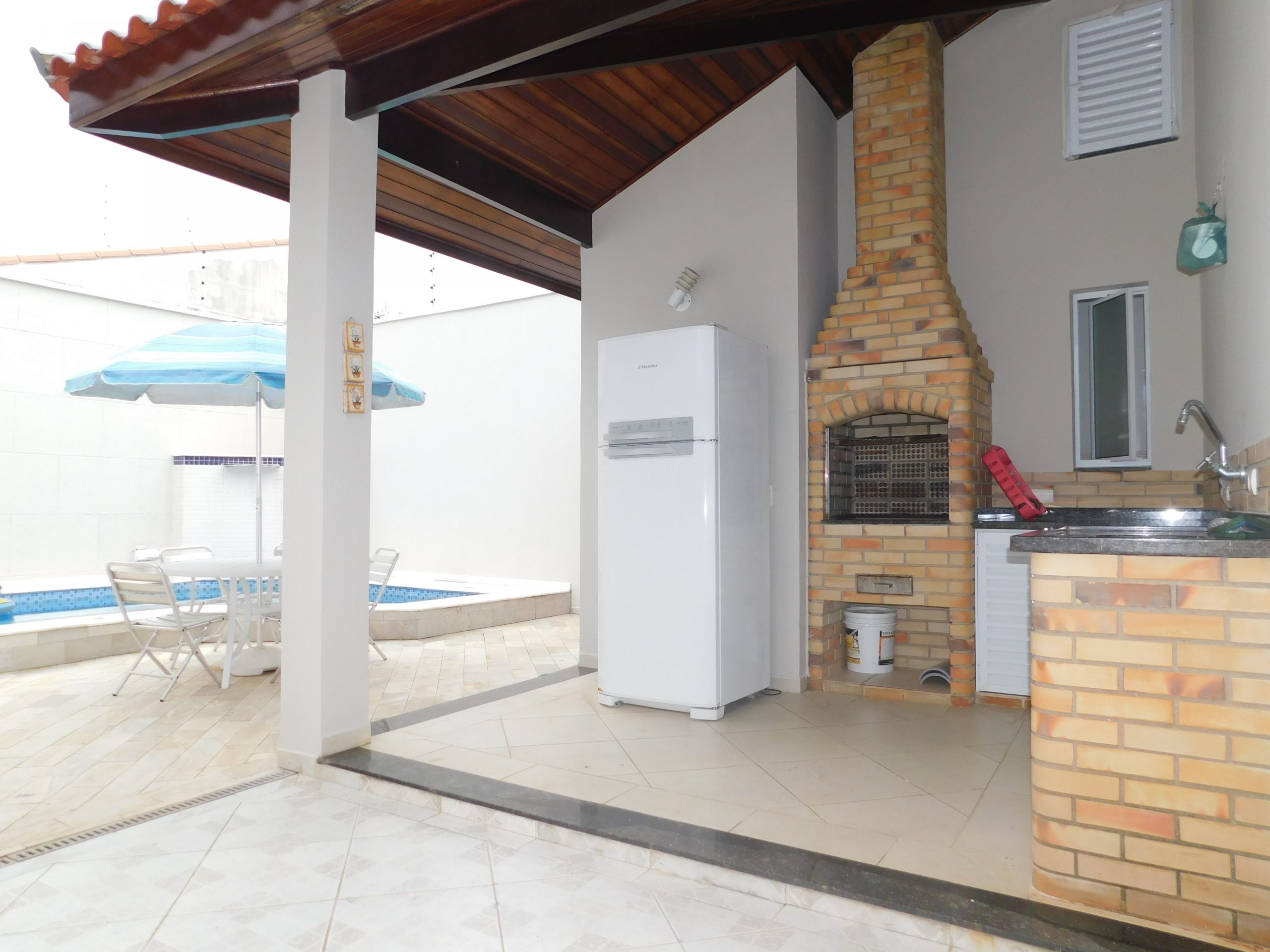 Piscina com cascata, área de churrasco completa, lavabo e lavanderia.